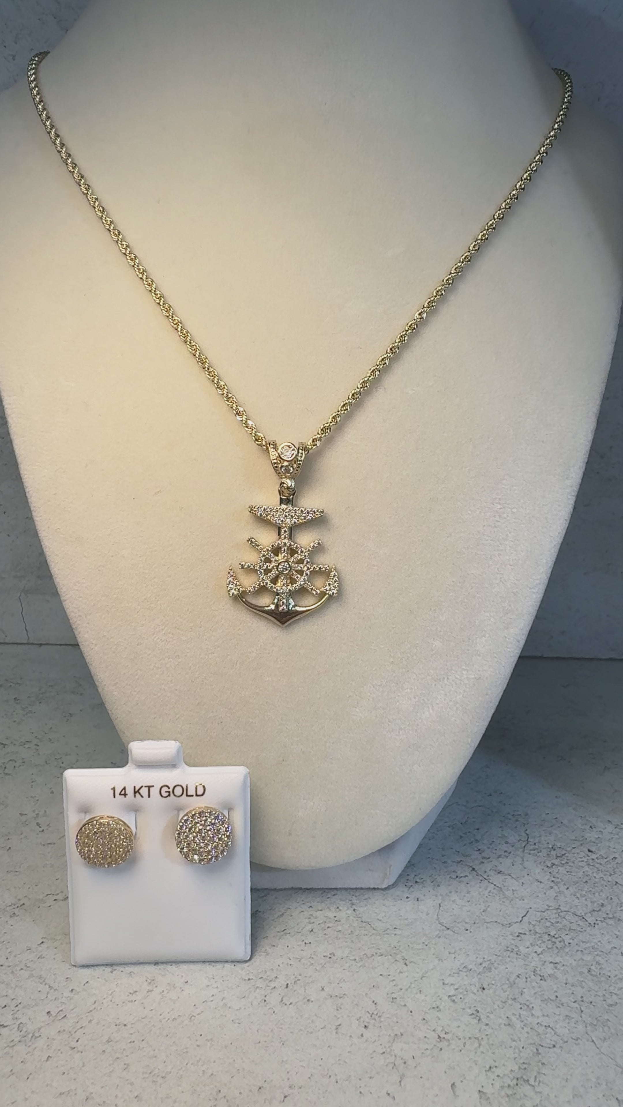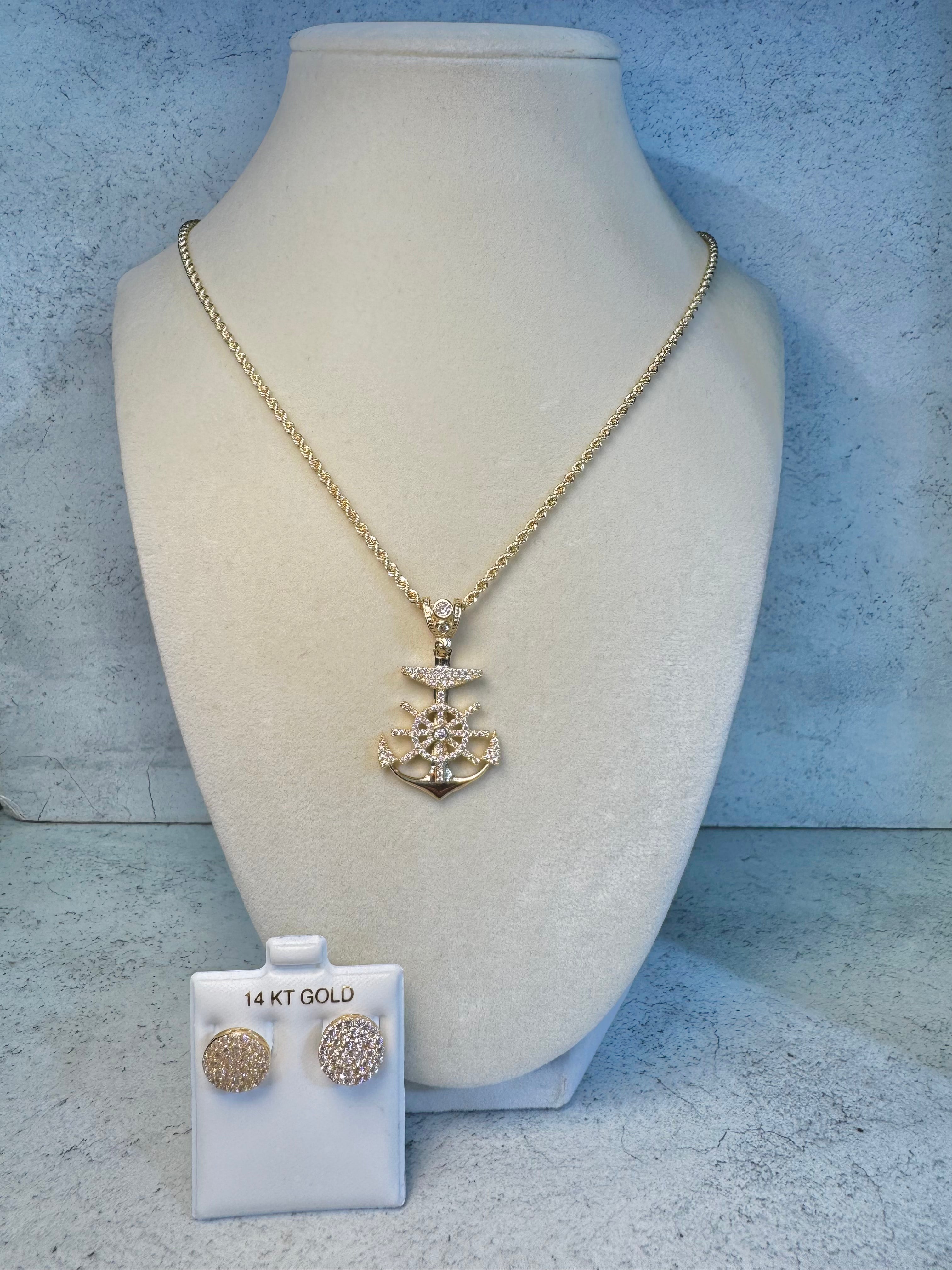 14Kt Rope Chain W/ Anchor Pendant and 14K Earrings