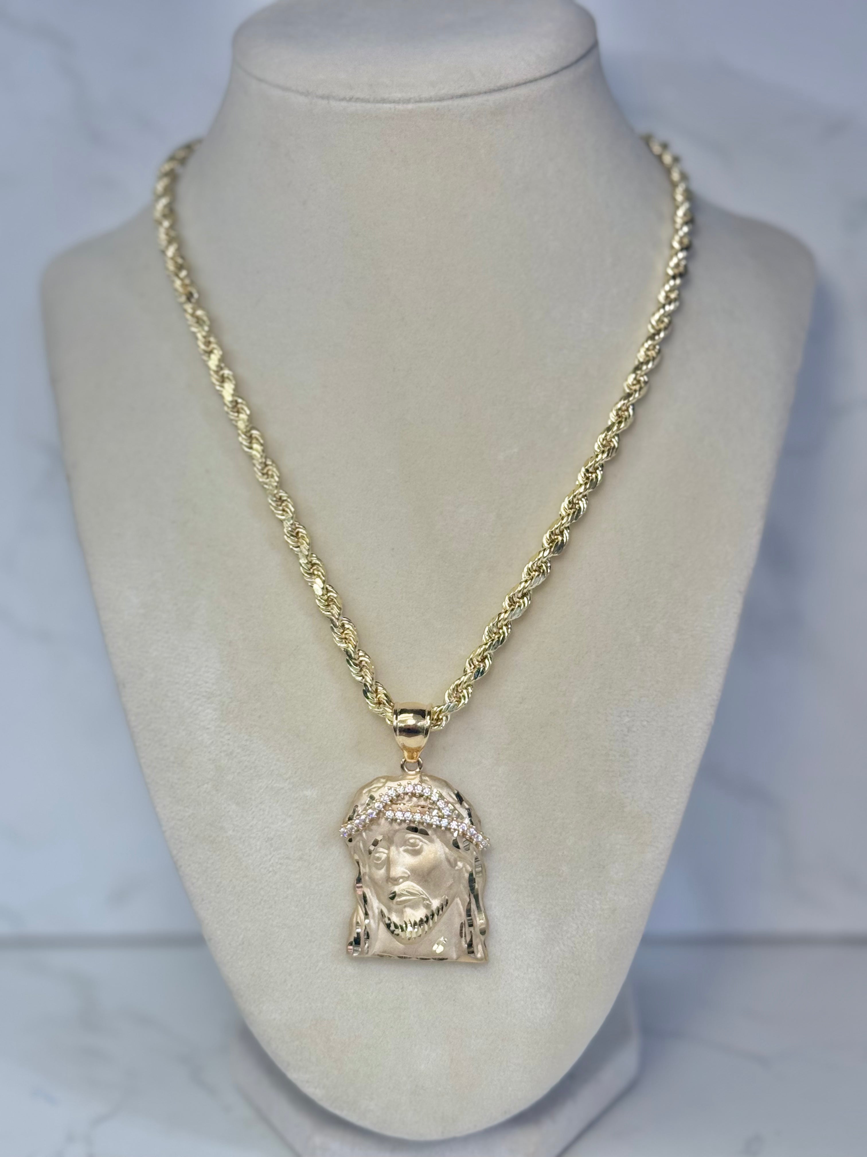 Solid Jesus Head W/ Rope Chain in 14kt Gold